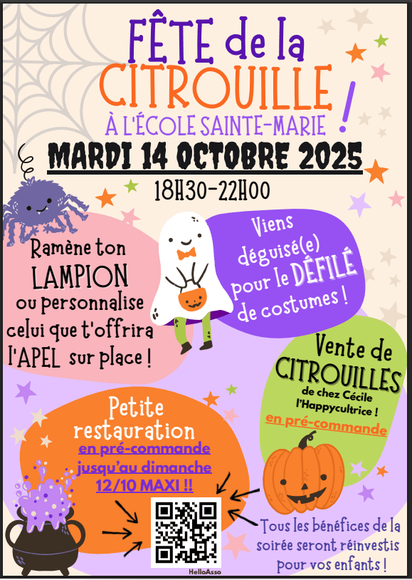 Préparez vos capes, vos chapeaux pointus et vos Ecocups : la Fête de la Citrouille de l’école Sainte-Marie aura lieu le mardi 14 octobre à partir de 18h30 dans la cour de l’école !